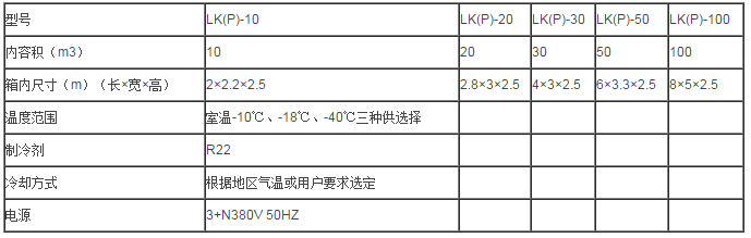 拼装式冷库 一、 主要用途: LK(P)系列拼装式冷库用医院、禽蛋仓库、食品行业等作药品、果品、禽蛋及肉、鱼类的冷藏保鲜之用。 二、 结构特点: LK(P)系列拼装式冷库是由拼装保温彩钢板(或不锈钢保温板)、制冷压缩机、蒸发器、风式冷凝器(或水冷式)、膨胀阀、电磁阀、贮液器、过滤器等部分组成,可根据客户要求生产不同类型冷库。 三、主要参数: